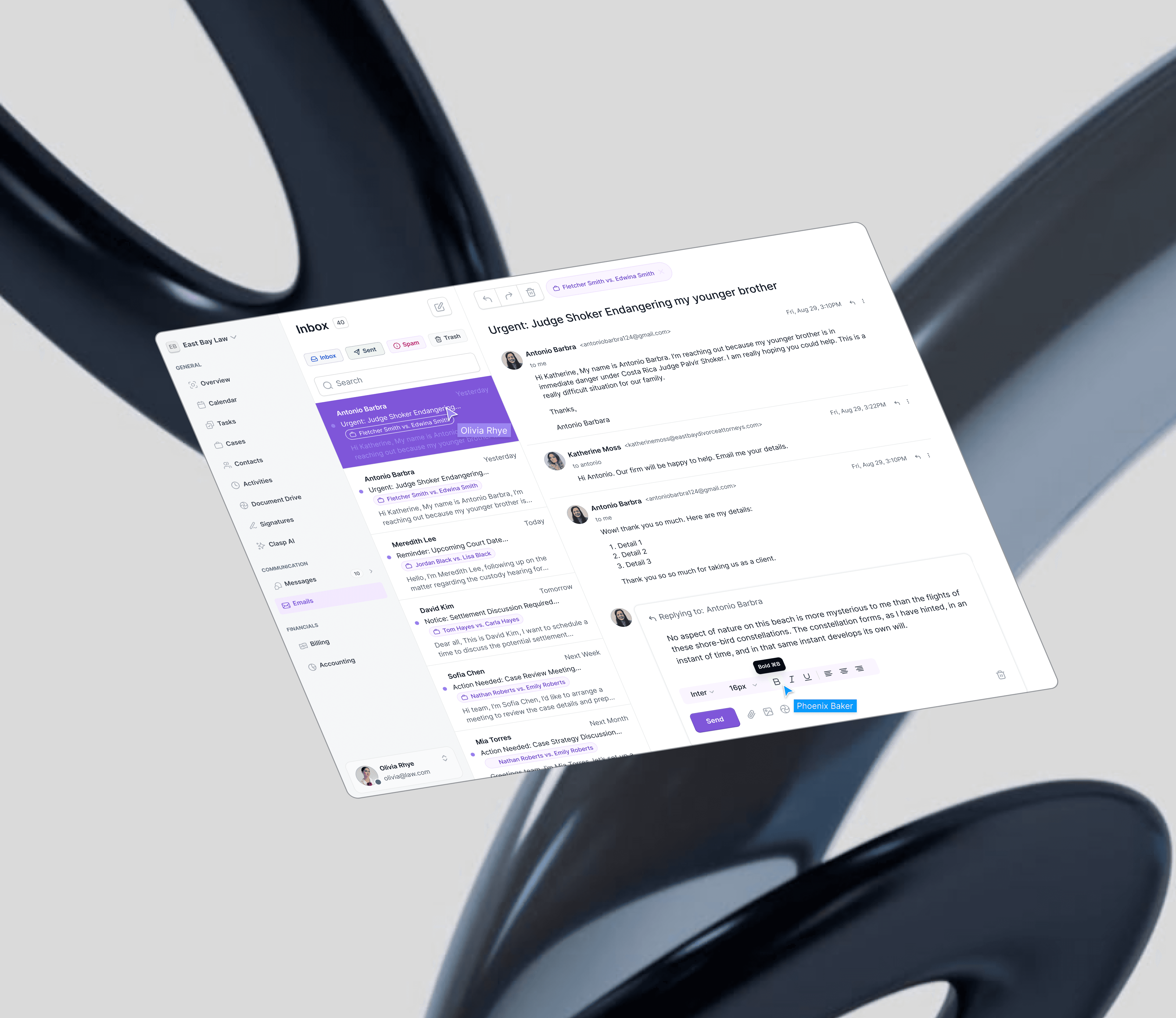 A big part of your job as an attorney is managing cases and moving them forward. Clasp helps with Document Storage, Client & Internal Team Communication, e-Signatures, Billing, and so much more.